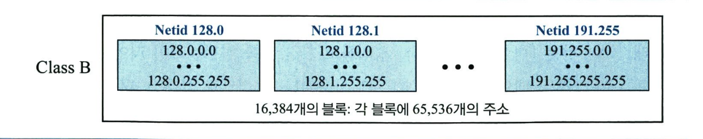 클래스 B의 두 바이트가 클래스를 나타내고 가장 왼쪽의 두 비트는 10이므로 다음 14비트는 이 클래스의 블록수를 찾는 데 사용된다. 그러므로 클래스 B는 2**14 = 16,384 블록으로 나누어지고 16,384 기관에 할당할 수 있다. 이 클래스의 각 블록은 65,536개의 주소를 포함하는데 이렇게 많은 주소를 사용할 수 있는 기관은 많지 않다. 다음 그림은 클래스 B의 블록들을 보여준다.