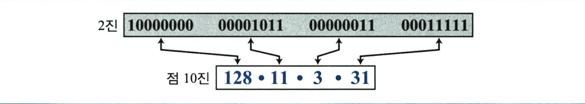 IPv4 주소를 보다 간결하고 읽기 쉽게 하려고 IPv4 주소를 보통 바이트를 구분하는 소수점(점)을 이용하여 10진 형식으로 표기한다. 이 형식은 점 10진 표기법(dotted-decimal notation)이라고 불린다. 다음 그림은 IP주소를 점 10진 표기법으로 나타내고 있다. 각 바이트(octet)는 8비트이므로, 점 10진 표기법에서 표현되는 각 숫자는 0과 155 사이의 값을 갖는다.