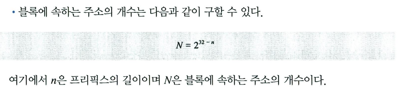 - 블록 내의 주소의 수 N은 N= 2**(32-n)이다.