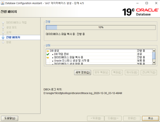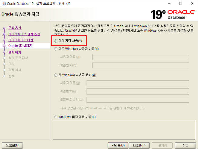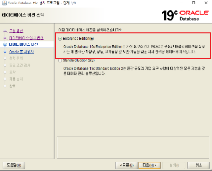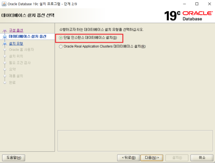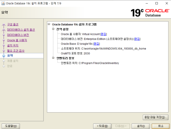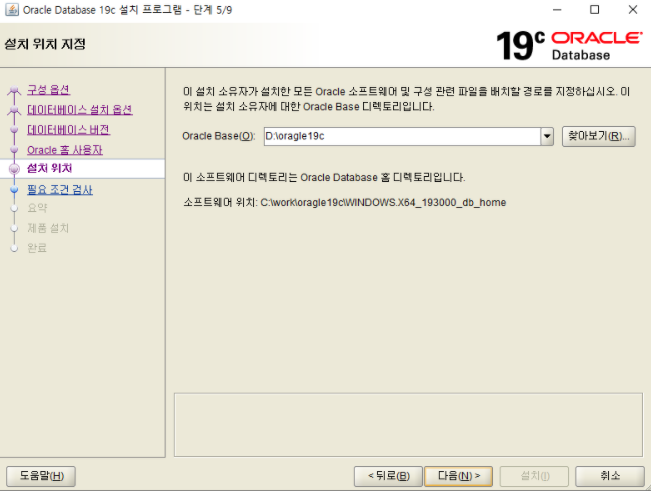 ✔설치 경로 선택(현재 D 아래에 oracle19c 폴더 생성후 경로 잡은상태)