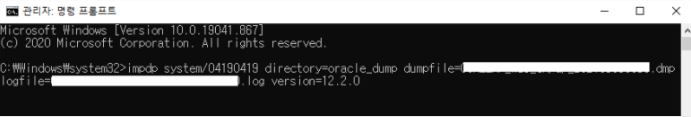 ▪ impdp system/sys비밀번호 directory=덤프파일넣은 디렉토리경로 dumpfile=덤프파일명.dmp logfile=로그파일명.log version=12.2.0