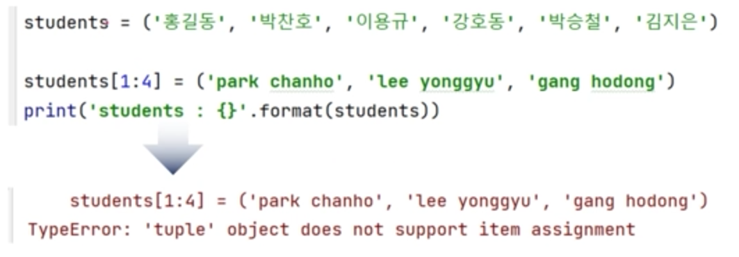 - Tuple은 slicing을 이용해서 아이템을 변경할 수 없다.