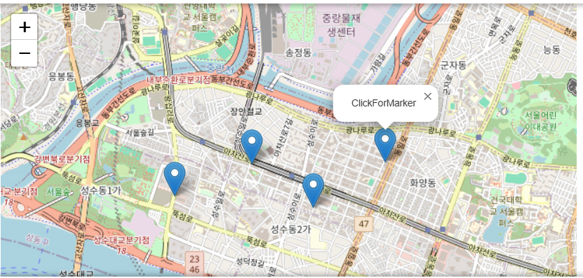m = folium.Map( location=[37.544564958079896, 127.05582307754338], # 성수역 zoom_start=14, tiles="OpenStreetMap" ) # 0 ~ 18 m.add_child(folium.ClickForMarker(popup="ClickForMarker"))