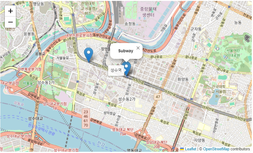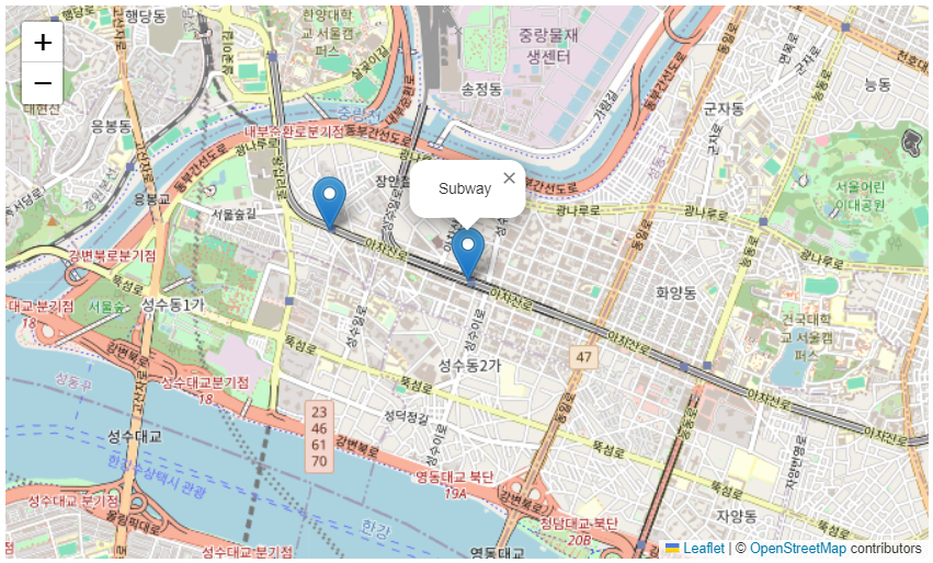 m = folium.Map( location=[37.544564958079896, 127.05582307754338], # 성수역 zoom_start=14, tiles="OpenStreetMap" ) # 뚝섬역 folium.Marker((37.54712311308356, 127.04721916917774)).add_to(m) # 성수역 folium.Marker( location=[37.544564958079896, 127.05582307754338], popup="<b>Subway<b>" ).add_to(m) # tooltip folium.Marker( location=[37.544564958079896, 127.05582307754338], popup="<b>Subway<b>", tooltip="성수역" ).add_to(m) m