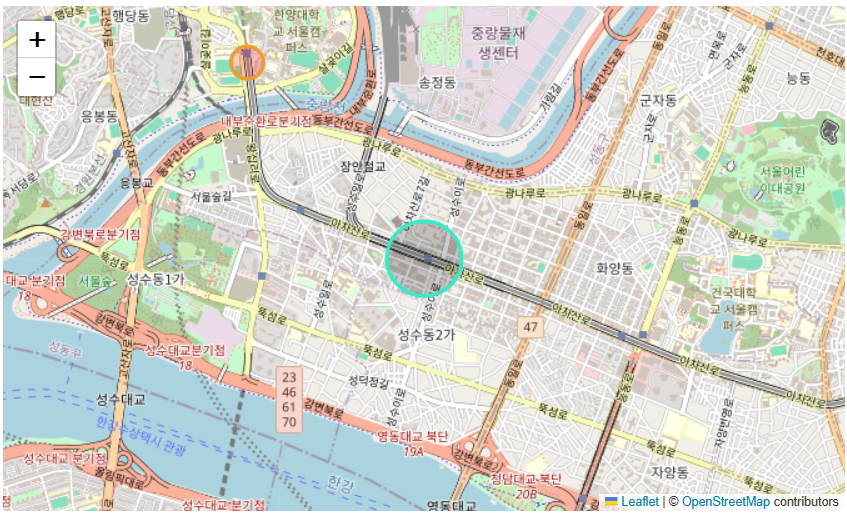 m = folium.Map( location=[37.544564958079896, 127.05582307754338], zoom_start=14, tiles="OpenStreetMap" ) # 0 ~ 18 # Circle folium.Circle( location=[37.555243442409406, 127.04370422643919], # 한양대학교 radius=100, fill=True, color="#eb9e34", fill_color="red", popup="Circle Popup", tooltip="Circle Tooltip" ).add_to(m) # CircleMarker folium.CircleMarker( location=[37.544564958079896, 127.05582307754338], radius=30, fill=True, color="#34ebc6", fill_color="c634eb", popup="CircleMarker Popup", tooltip="CircleMarker Tooltip" ).add_to(m) m
