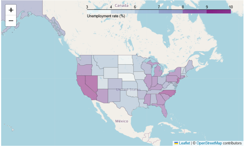 m = folium.Map([43, -102], zoom_start=3) folium.Choropleth( geo_data="../data/02. us-states.json", # 경계선 좌표값이 담긴 데이터 data=state_data, # Series or DataFrame columns=["State", "Unemployment"], # DataFrame columns key_on="feature.id", fill_color="BuPu", fill_opacity=0.5, # 0~1 line_opacity=0.2, # 0~1 legend_name="Unemployment rate (%)" ).add_to(m) m