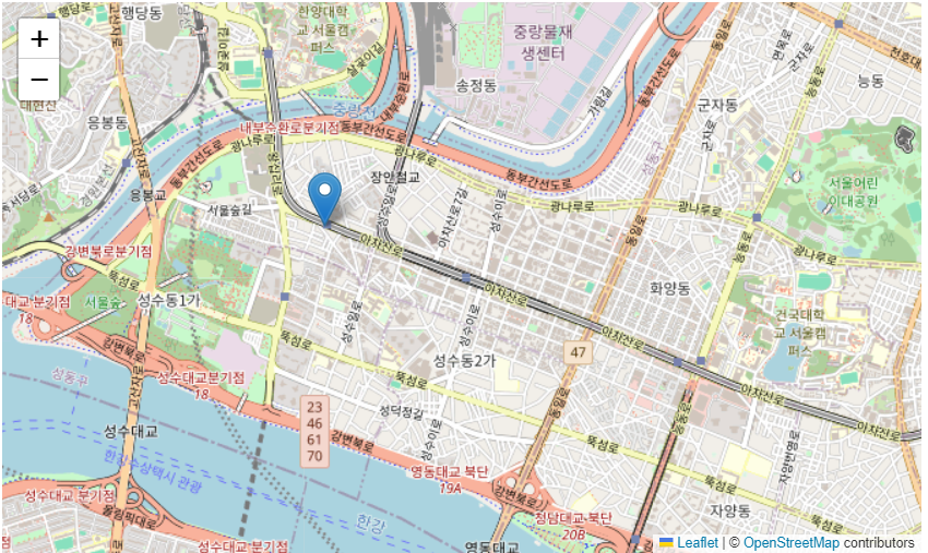 m = folium.Map( location=[37.544564958079896, 127.05582307754338], # 성수역 zoom_start=14, tiles="OpenStreetMap" ) # 뚝섬역 folium.Marker((37.54712311308356, 127.04721916917774)).add_to(m) m