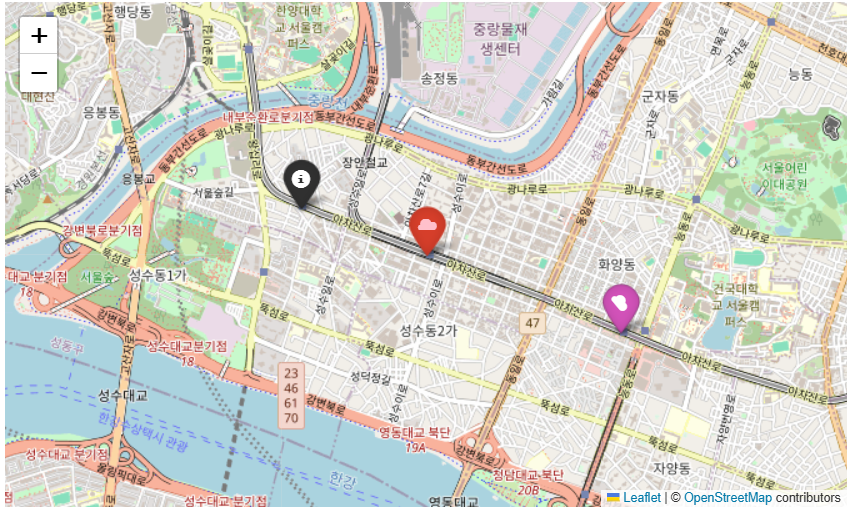 m = folium.Map( location=[37.544564958079896, 127.05582307754338], # 성수역 zoom_start=14, tiles="OpenStreetMap" ) # icon basic folium.Marker( (37.54712311308356, 127.04721916917774), icon=folium.Icon(color="black", icon='info-sign') ).add_to(m) # icon icon_color folium.Marker( location=[37.544564958079896, 127.05582307754338], popup="<b>Subway<b>", tooltip="icon color", icon=folium.Icon( color="red", icon_color="pink", icon="cloud" ) ).add_to(m) # Icon custom folium.Marker( location=[37.54035903907497, 127.06913328776446],# 건대입구역 popup="건대입구역", tooltip="Icon custom", icon=folium.Icon( color="purple", icon_color="green", icon="bookmark") ).add_to(m) m