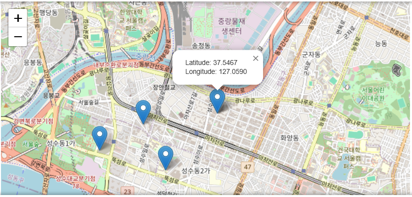 m = folium.Map( location=[37.544564958079896, 127.05582307754338], # 성수역 zoom_start=14, tiles="OpenStreetMap" ) # 0 ~ 18 m.add_child(folium.ClickForMarker())