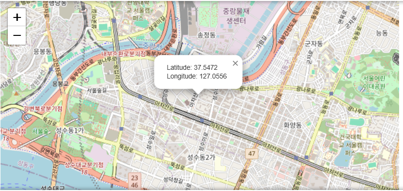 m = folium.Map( location=[37.544564958079896, 127.05582307754338], # 성수역 zoom_start=14, tiles="OpenStreetMap" ) # 0 ~ 18 m.add_child(folium.LatLngPopup())