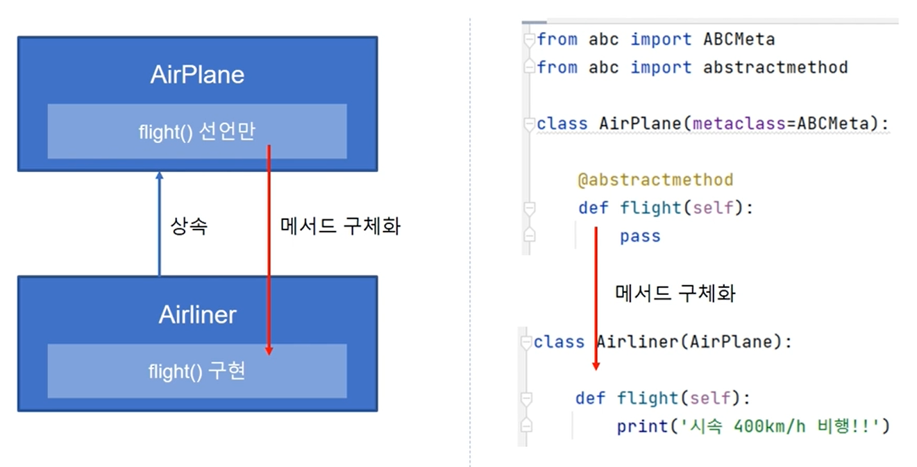 상위 클래스에서 하위 클래스에게 메서드 구현을 강요한다. 이를 위해 abc 모듈에서 ABCMeta와 abstractmethod를 가져와 클래스를 추상화하고, 추상 메서드를 정의한다.