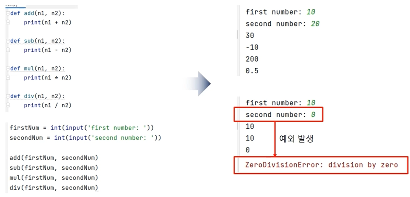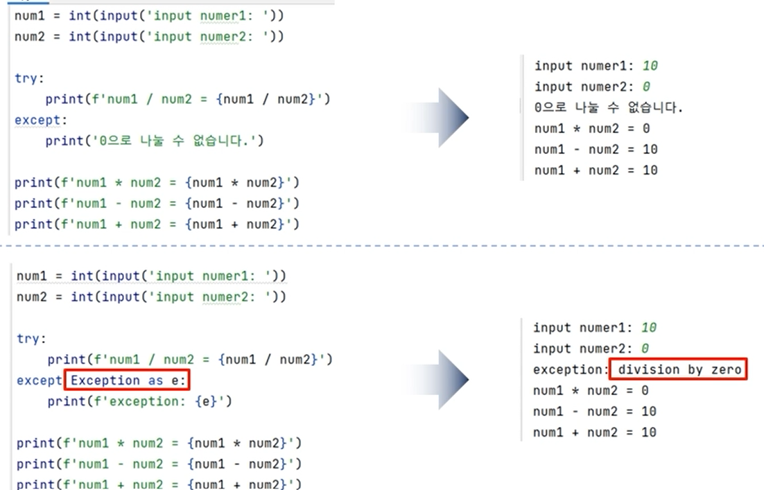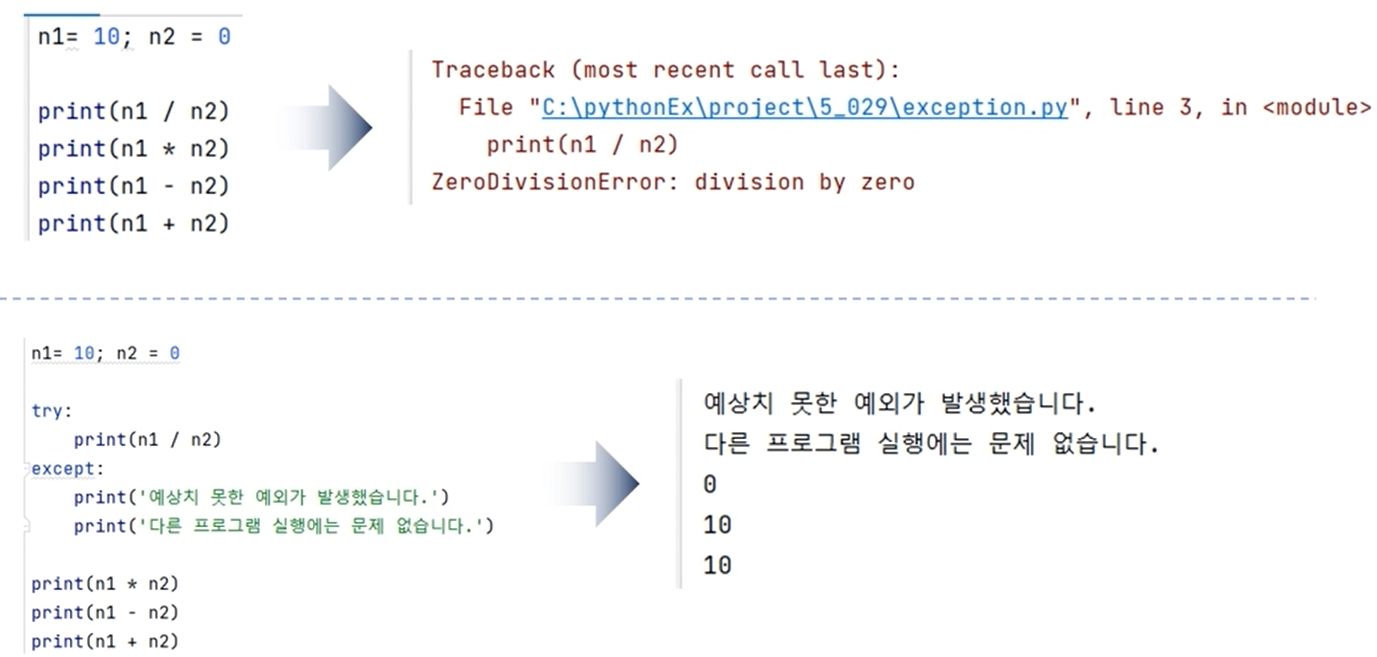 예외 발생 예상 구문을 try ~ except로 감싼다.
