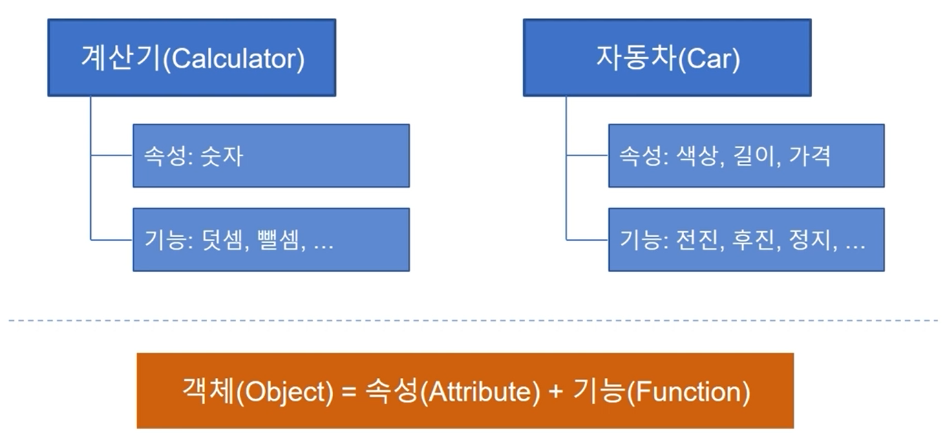 객체를 이용한 프로그램으로 객체는 속성과 기능으로 구성된다.
