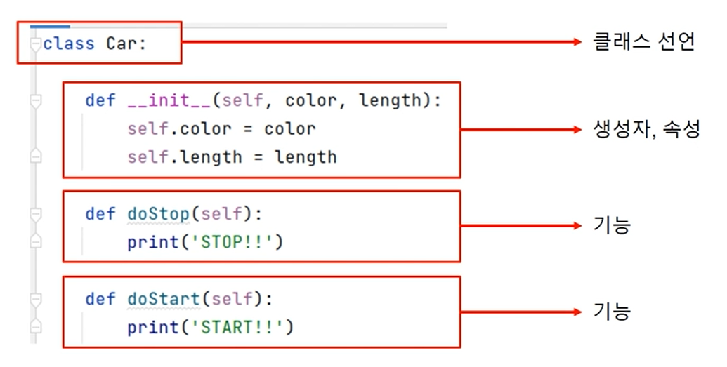 클래스는 class 키워드와 속성(변수) 그리고 기능(함수)를 이용해서 만든다.