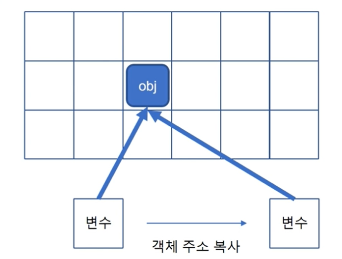 변수는 객체의 메모리 주소를 저장하고 이를 이용해서 객체를 참조한다.