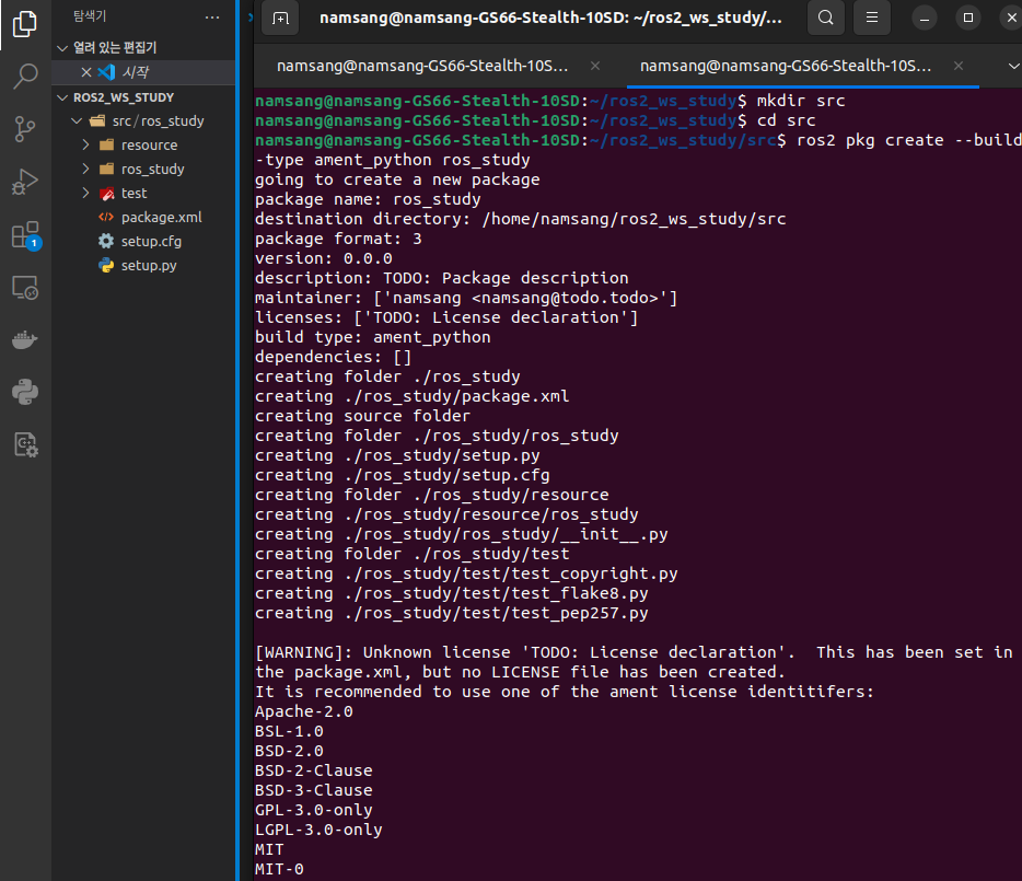ros2 pkg create [package_name] --build-type ament_python --dependencies [의존 패키지] # 파이썬으로 패키지 생성