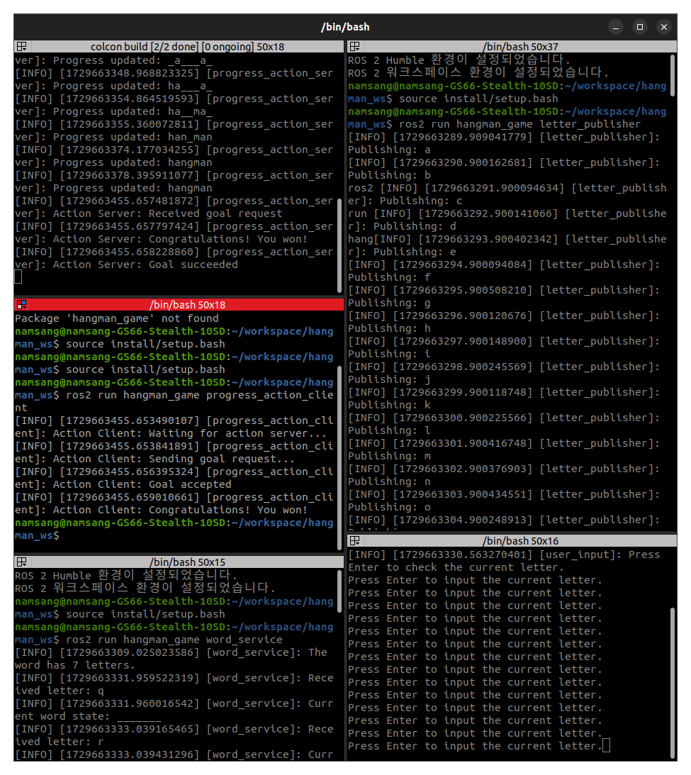 word_service: check_letter, letter_topic, progress의 서비스와 토픽을 통해 서비스 생성, 구독자 생성, 퍼블리셔 생성 --> 무작위로 단어를 선택 후 수신한 메시지를 처리, 저장하여 진행상황을 토픽으로 전달