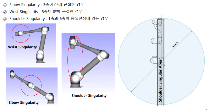 선형 이동 중 특이점 자세를 지나갈 때에 부저연스러운 움직임과 급격한 속도 및 자세 변화롤 인하여, 조인트 각도 제한 위반 또는 조인트 속력 제한 위한 에러가 발생할 수 있다