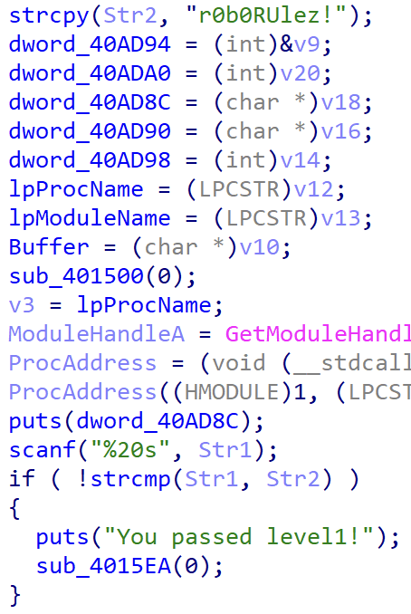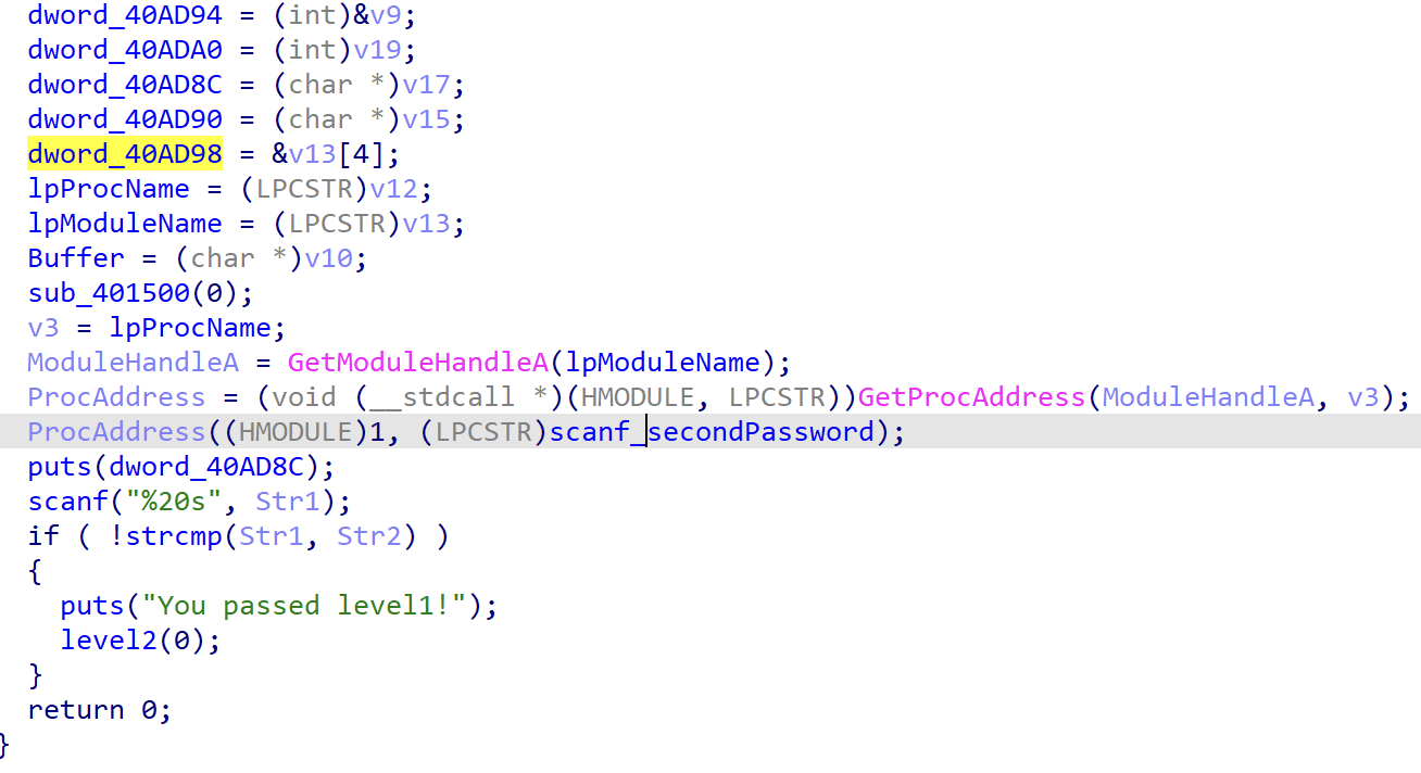 level1 전에 위에서 선언된 암호화된 문자열들을 외부 모듈을 이용하여 복호화하는 것 같다.