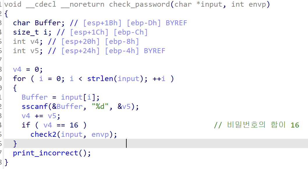 그 합이 16이라면 check2 함수로 넘어감 -> 비밀번호의 합은 16