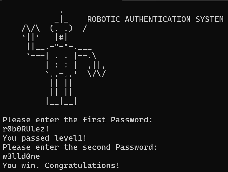 "r0b0RUlez!" 문자열을 이용해 level1 pass