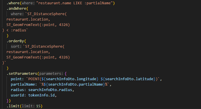 동시에, 개수를 15개로 제한하는데 이때, searchInfoDto.location 즉