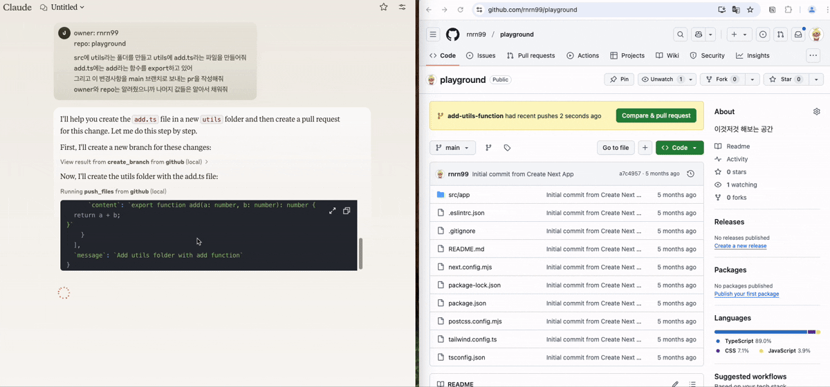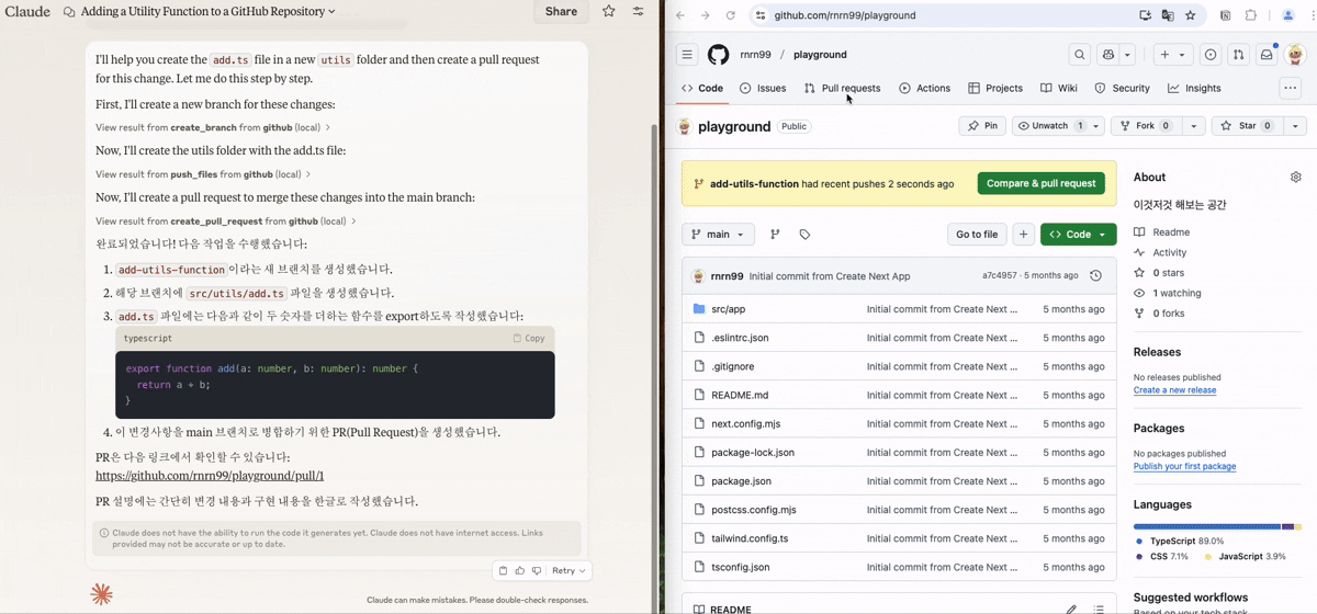 Claude는 제 요청 대로 브랜치를 만들고, add 함수를 작성한 후 커밋을 올렸습니다.