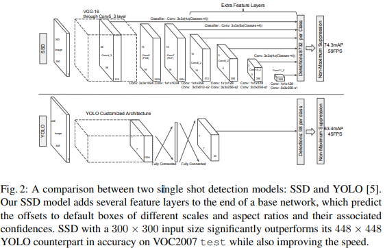 SSD는 Faster-RCNN 처럼 사전 정의된 앵커를 사용하면서도 YOLO와 같이 바운딩 박스 크기를 함께 예측합니다. 앵커를 사용함으로써 아래 구조에서 볼 수 있다시피 다양한 스케일의 피쳐맵을 사용할 수 있습니다. 또한 네거티브 샘플링 기법을 사용함으로써 성능을 높혔습니다.