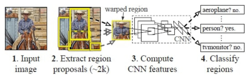 RCNN은 객체 탐지의 초창기 대표적인 모델이며 프레임워크는 다음 그림과 같이 4단계로 설명될 수 있습니다.