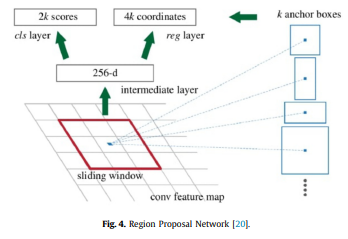 RPN은 아래 사진과 같이 sliding window를 사용하여 중심점(anchor)을 기준으로 각기 다른 크기 (미리 정해진) 의 ROI를 추출한 뒤, Fast RCNN처럼 객체 분류기, 객체의 존재유무를 학습하는 네트워크를 한번에 학습합니다. 이러한 방식은 selective search대신 객체 존재 유무를 확인하는 네트워크를 사용하지 않음으로써 속도와 성능 측면에서 이점을 갖습니다.