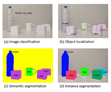 Mask RCNN은 faster RCNN을 활용하여 object detection과 semantic segmentation이 결합된 instance segmentation을 수행하기 위해 고안되었습니다. Instance segmentation은 아래 그림과 같이 sementic segmentation에서 나아각 instance(객체) 까지도 구별하는 과제를 의미합니다.