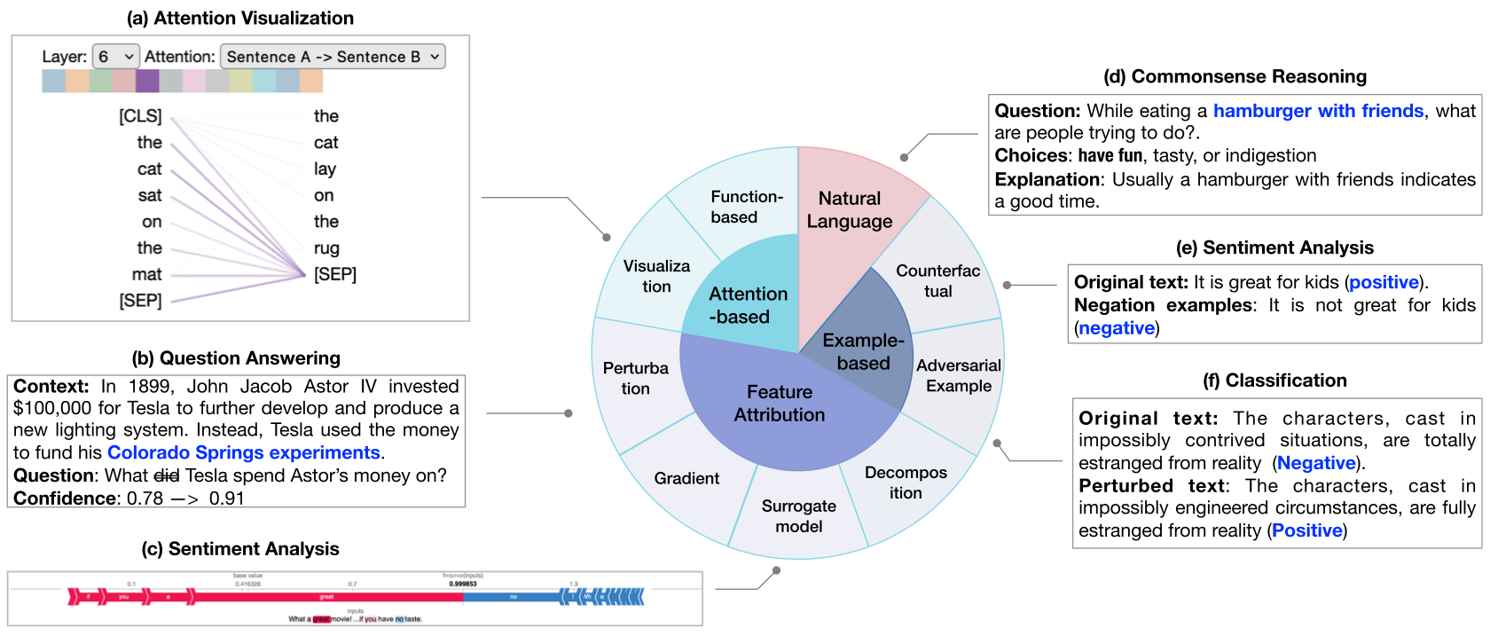 우선 local explanation는 앞서 말씀 드린 것 처럼 input에 dependent한 설명을 의미합니다. 즉, input sentence가 들어오고 sentiment classification, generation등이 진행되었을 때 해당 task에 관해 중요한 input token등을 명확히 하는 시나리오등을 생각해볼 수 있습니다. 이러한 local explanation method들은 아래와 같은 figure와 같이 분류될 수 있습니다.