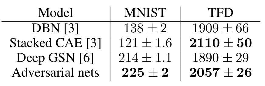 첫번째 실험은 아래와 같이 생성된 데이터 들의 loglikelihood(∑xlogp(x∣z)=∑pg ) 비교 실험 입니다. 다만 GAN은 p_{g}을 explicit하게 계산할 수 없기 때문에 parzan window를 사용한 비모수적 추정법을 이용했다고 합니다.