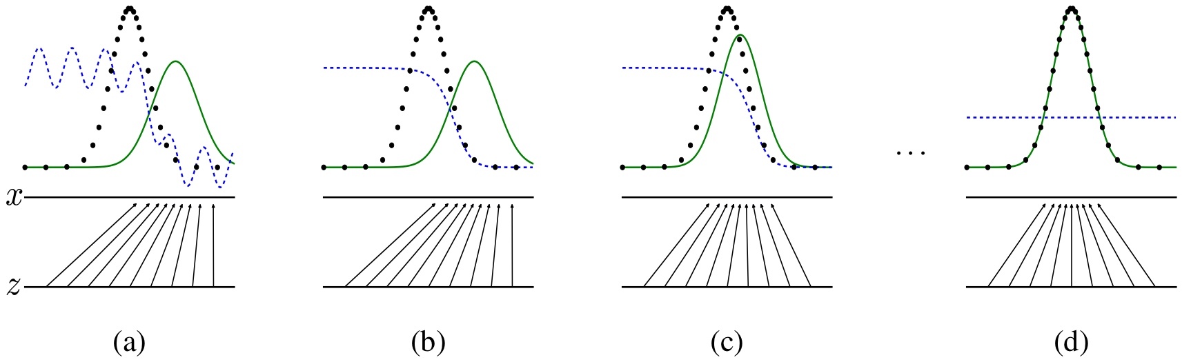 이러한 과정은 반복적으로 이루어집니다. 저자는 만약 D가 iner loop에서 학습될 경우 (그냥 G와 반복적으로 학습되지 않을 경우) 몇몇의 data에 대해서 오버피팅이 이루어진다고 합니다. 따라서 discriminator를 몇 스텝 학습하고 generator를 학습하는 과정을 반복적으로 수행해 optimal solution에 도달하도록 합니다. 저자는 이학습 과정을 아래와 같은 figure를 통해 설명합니다.