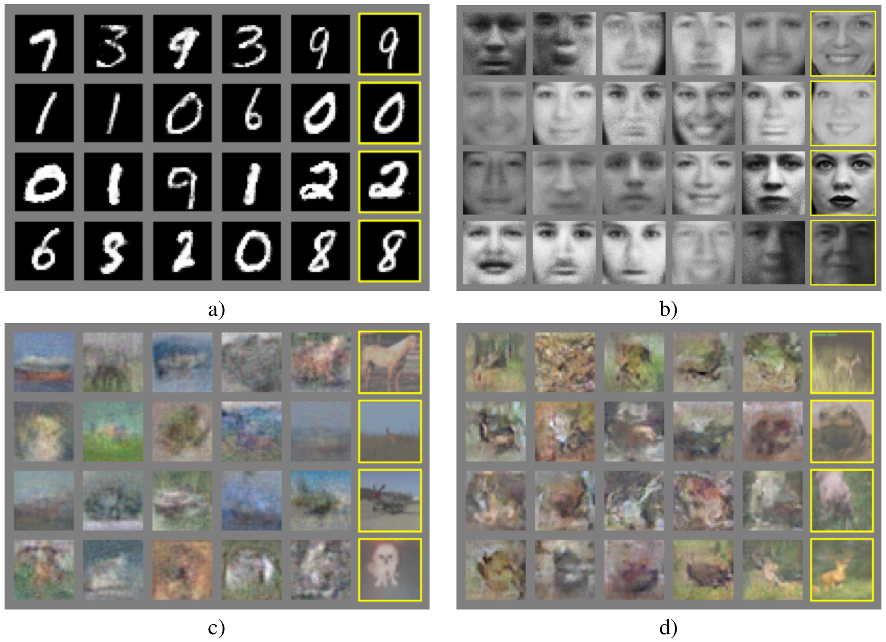 - (b)는 이러한 generator에 의해 discriminator가 학습된 것을 나타냅니다.