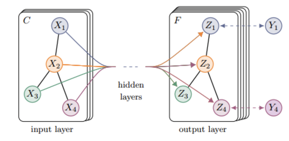 논문을 리뷰하기 전에 우선 'Inductive'라는 용어에 대해서 간단히 설명하겠다. 정확한 반대의 의미는 아니지만 해당 용어의 대척점에 있는 용어중 'transductive'라는 용어가 있다. gnn 분야에서 사용 되는 transductive란 input graph 내에서 task를 수행하는 것이다. 예를들어 'Semi-Supervised Classification with Graph Convolutional Networks'에서는 GCN을 제시하고 semi supervised learning을 수행하는데 이는 다음 그림과 같이 이미 label을 아는 노드를 중심으로 gcn 모델의 가중치를 학습 시켜 label을 알지 못하는 노드들에 대해서 node prediction을 진행한다.(해당 그림에서는 학습전엔 의 경우는 label을 알고 있고 나머지 노드는 라벨을 알지 못한다.) 이경우 새로운 input 그래프에서 task를 수행하기 위에서는 재학습이 필요하며, 가중치 행렬의 모양이 고정되어 있기 때문에 새로운 모양의 graph의 경우 학습이 매우 어려워 진다.