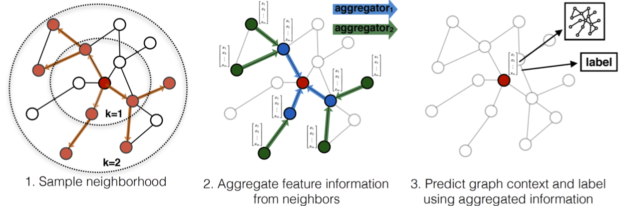 따라서 기존 일반적인 gnn 모델들과 같이 각각의 node 혹은 graph들이 구별될 수 있도록 하는 embedding에 집중하여 학습시키는 방법과는 다르게 그림과 같이 기준 노드를 중심으로 하나이상의 k-hop-aggregator를 학습시켜 노드 주변의 feature들을 집계하고 structure를 파악할 수 있도록 한다.
