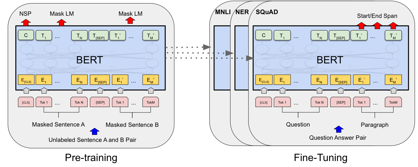 사전 학습은 총 2가지 Masked Language Modeling(MLM)과 Next Sentence Prediction (NSP)로 진행됩니다. 양방향으로 보는만큼 generation task를 수행하는 만큼 CLM을 적용하기는 힘들었는 듯 합니다. 또한 후에 RoBERTa 논문에서는 NSP의 효용성에 대해 의구심을 표현하기도 했습니다.