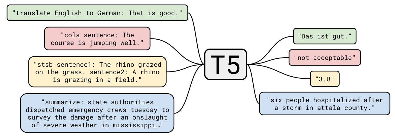 LLM이 다양한 NLP task에서 높은 성능을 내고 있지만 여전히 모델의 파라미터수나 데이터셋을 늘리는 데에만 집중하고 있습니다. 따라서 본 논문은 scale-up된 LLM들과 상당히 큰 데이터 셋등 다양한 조건에서 LLM들을 비교, 실험하는데 집중하고 있습니다. 이를위해서는 task, model에 따른 학습방법이 일정해야 하기 때문에 고안된 방법이 text-to-text를 활용하는 것입니다. text-to-text는 아래 그림과 같이 모든 NLP task를 generation task로 하여 학습하는 것을 의미합니다.