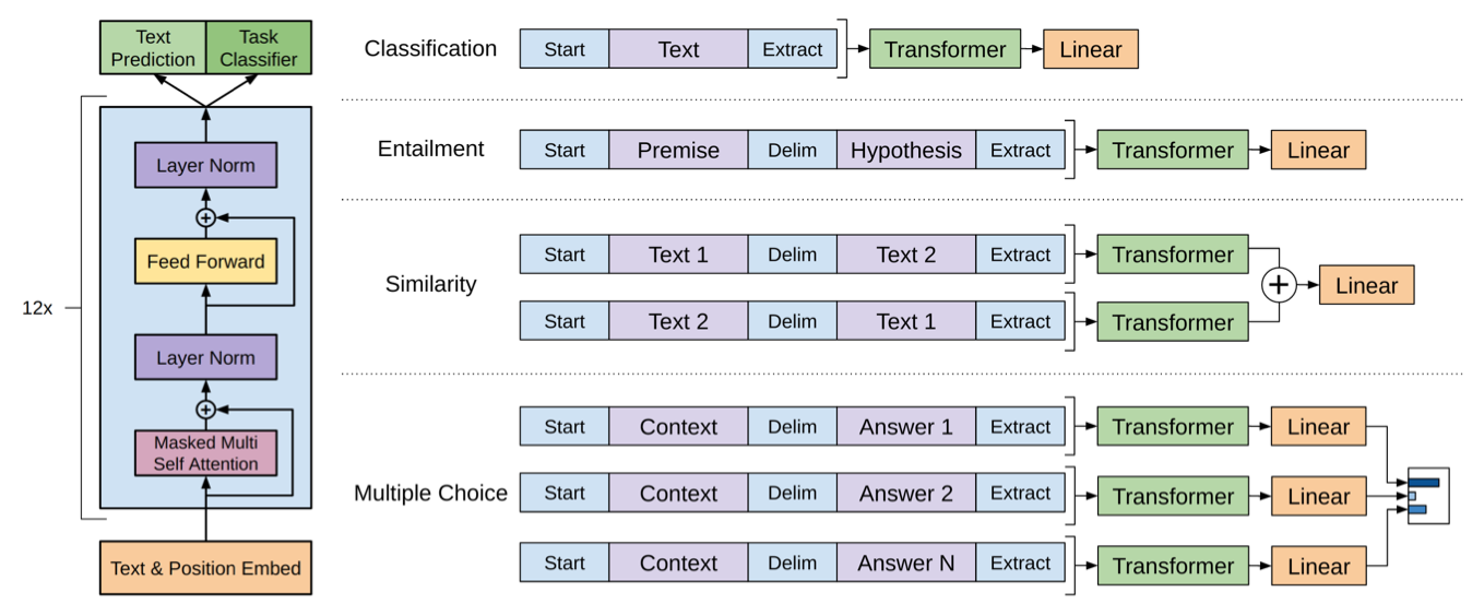 모델의 구조는 다음과 같이 generation을 위한 transformer의 decoder의 구조와 거히 유사한 형태를 띄고 있습니다. 또한 그림을 통해 다양한 task를 수행하기 위해 추출된 sentence 혹은 token 임베딩을 어떻게 활용하는지도 알 수 있습니다.
