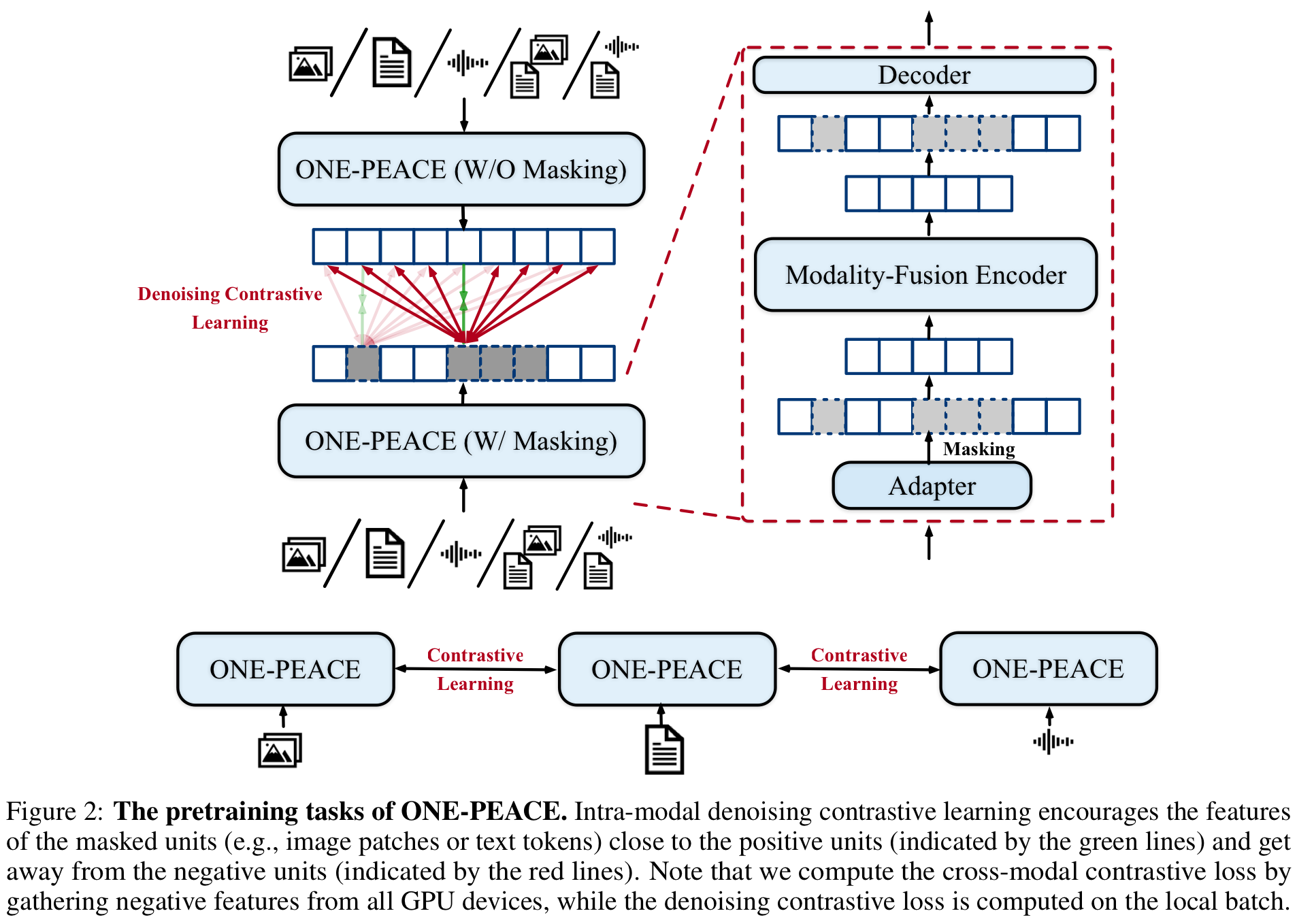 ONE-PEACE의 사전학습은 Cross-Modal Contrastive Learning과 Intra-Model Denoising Contrastive Learning로 구성되어 있으며 대략적으로 아래 그림과 같이 진행됩니다.