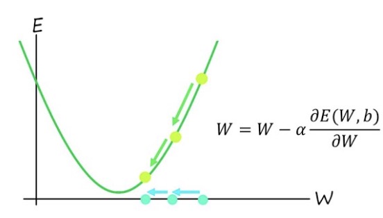 현재 손실값이 이고 이를 감소 시키기 위해 값을 조정해본다고 가정하겠습니다. 그렇다면 손실값을 줄이기 위해 = 현재 값 - (현재 값에서 손실함수의 기울기)와 같은 식을 세울 수 있습니다. 해당식은 기울기가 양수라면 의 값을 감소시켜야하고 음수라면 증가시켜야하기 때문에 -부호가 들어갔습니다. 결론적으로 이를 식으로 나타내면 아래 그림과 같이 과 같은 식으로 나타낼 수 있습니다. 여기서 는 학습률(learning rate)를 의미하며 가 조정되는 정도를 조절하는 역할을 가지고 있습니다.