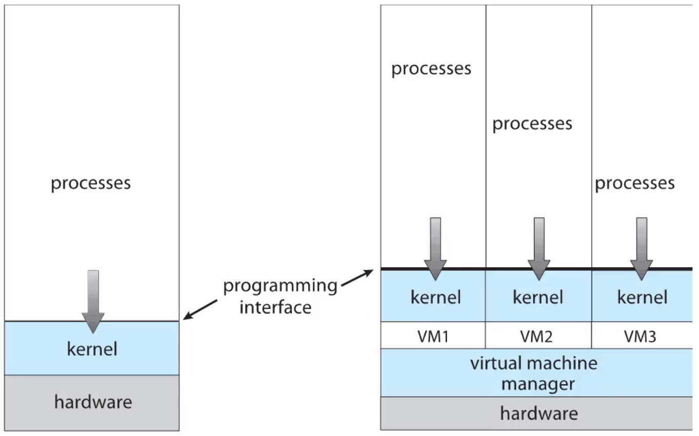 - 하드웨어와 운영체제 사이에 VMM을 두면 여러 개의 운영체제를 사용할 수 있음
