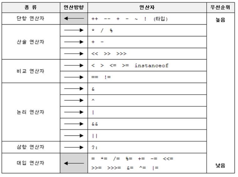 | 기타 | (type) ?: instanceof | 형변환 연산자, 삼항 연산자, instanceof 연산자 |