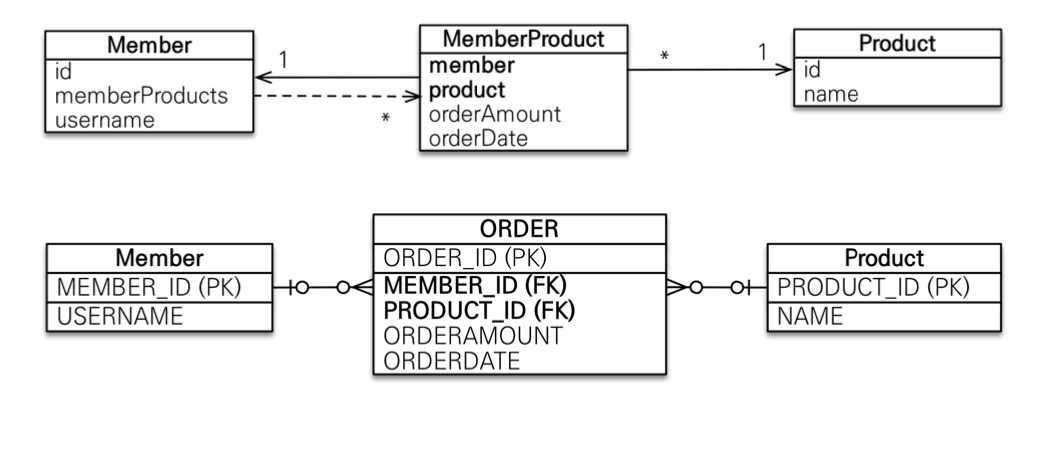 - 객체는 컬렉션을 사용해서 객체 2개로 다대다 관계 가능
