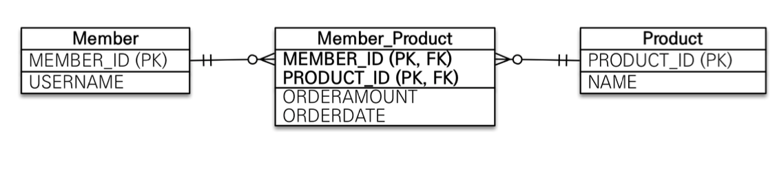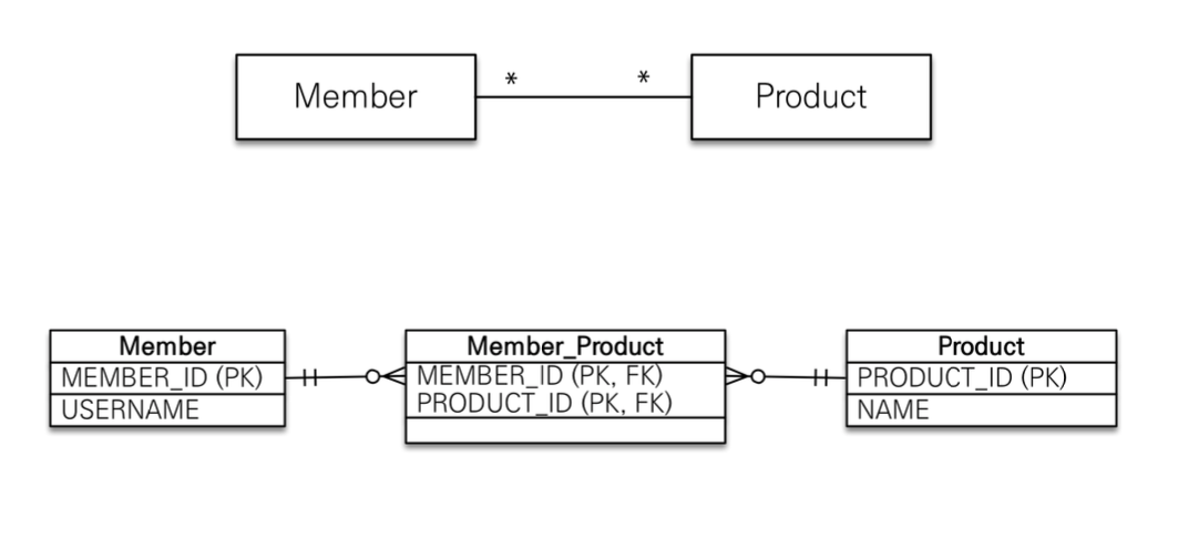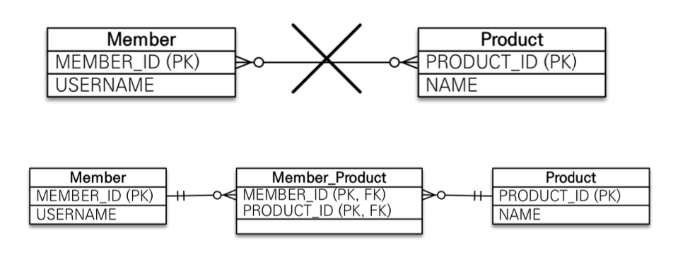 - 관계형 데이터베이스는 정규화된 테이블 2개로 다대다 관계를 표현할 수 없음