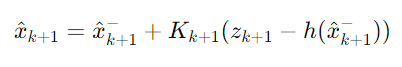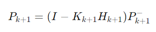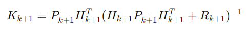 여기서 Kk+1은 칼만 이득, Hk+1은 측정 행렬의 미분, Rk+1은 측정 노이즈의 공분산 행렬이다.