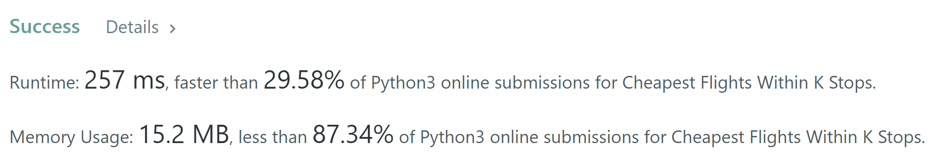 Dijkstra 알고리즘 을 생각했으나, 해당 알고리즘은 최소 경로를 찾는데 유용하기에 k개 이하의 node를 거친다는 constraint가 존재할 경우 사용하기에 적절하지 않다는 생각이 들었다. Bellman-Ford 알고리즘 이다. 해당 알고리즘은 vertex의 수 - 1 번 모든 vertex에 대해 연결된 타 vertex를 거쳐 오는 게 더 짧은지 비교하는 알고리즘으로 그래프 내에 음수 distance가 존재하더라도 풀 수 있다. class Solution: