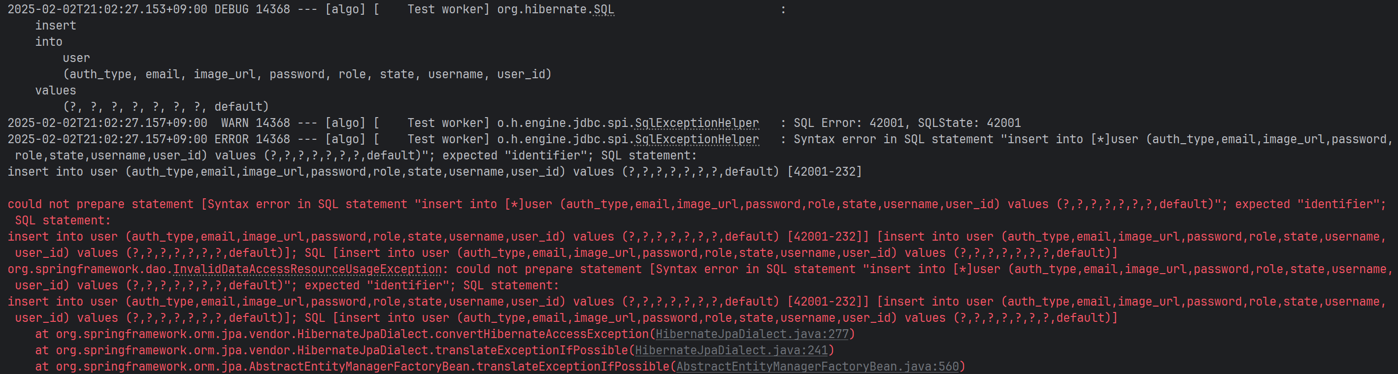 저는 JPA로 USER라는 엔티티를 사용하고 있는데 테스트 중 SQL 문법 오류가 발생했습니다.