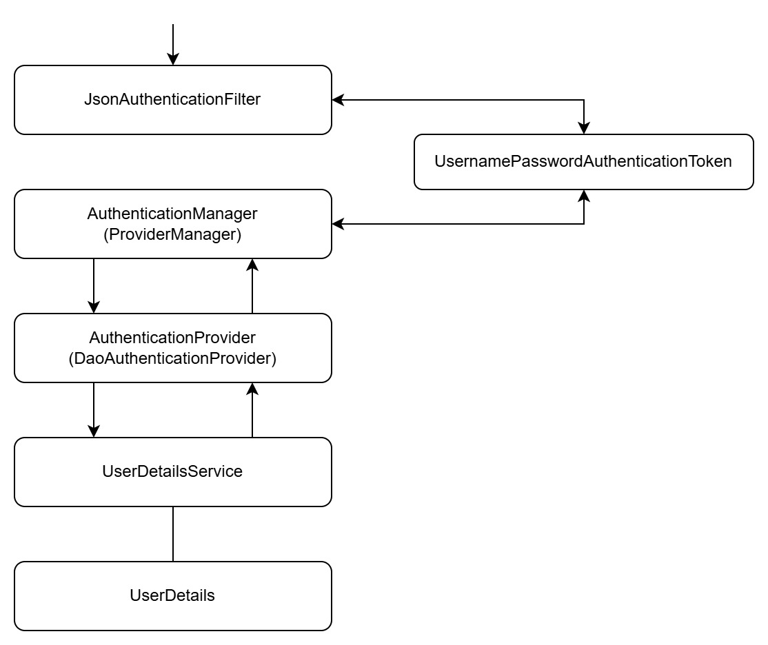 해당 필터는 JSON 데이터를 파싱하여 UsernamePasswordAuthenticationToken을 생성하여 AuthenticationManager가 인증을 처리하도록 합니다.